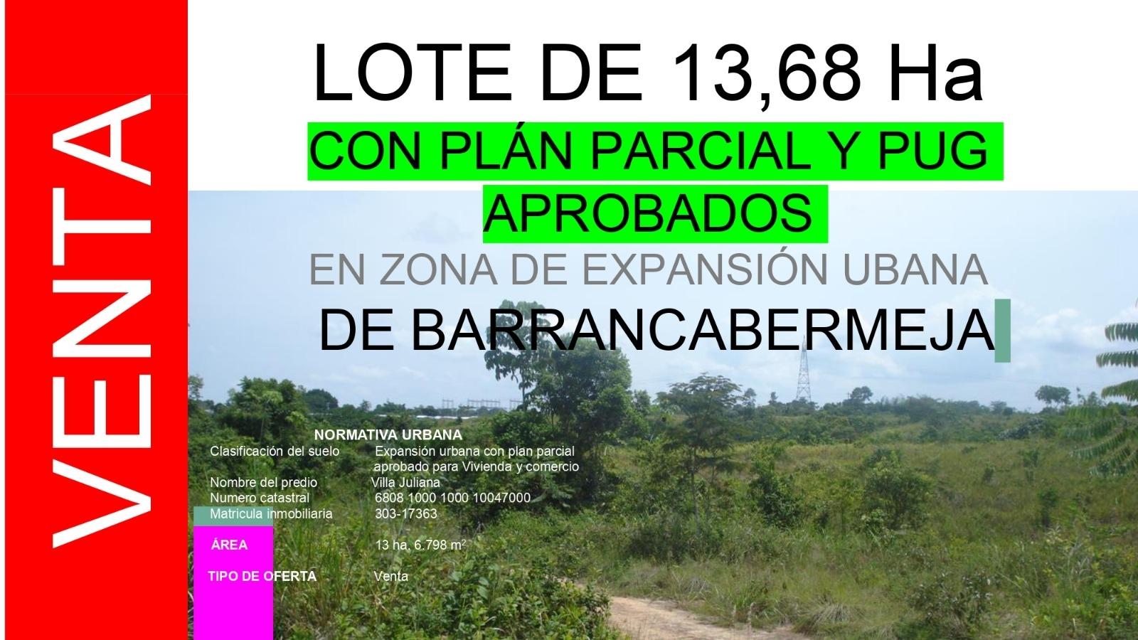 En venta lote de 13,68 hectáreas, con plan y pug aprobados en zona de expansión urbana de Barrancabermeja. NORMATIVA URBANA Clasificación del suelo Expansión urbana con plan parcial aprobado para Vivienda y comercio .